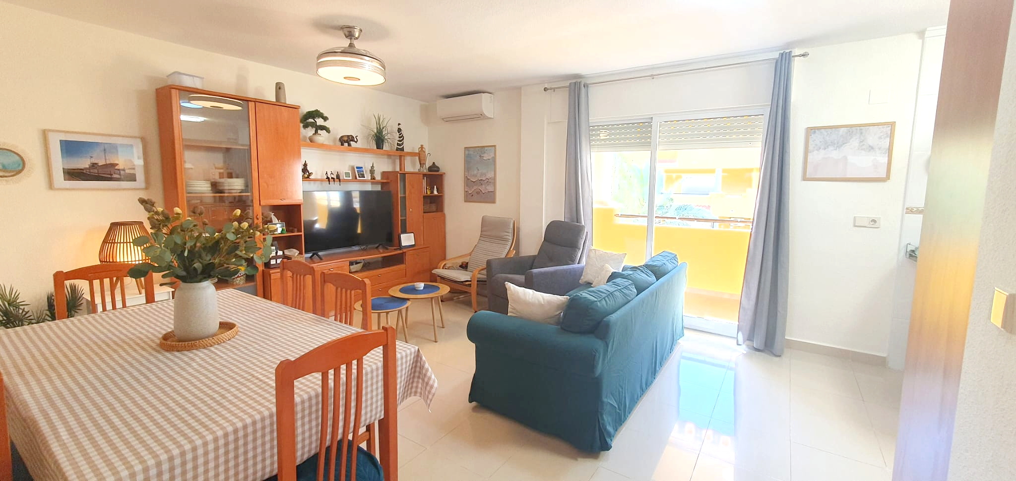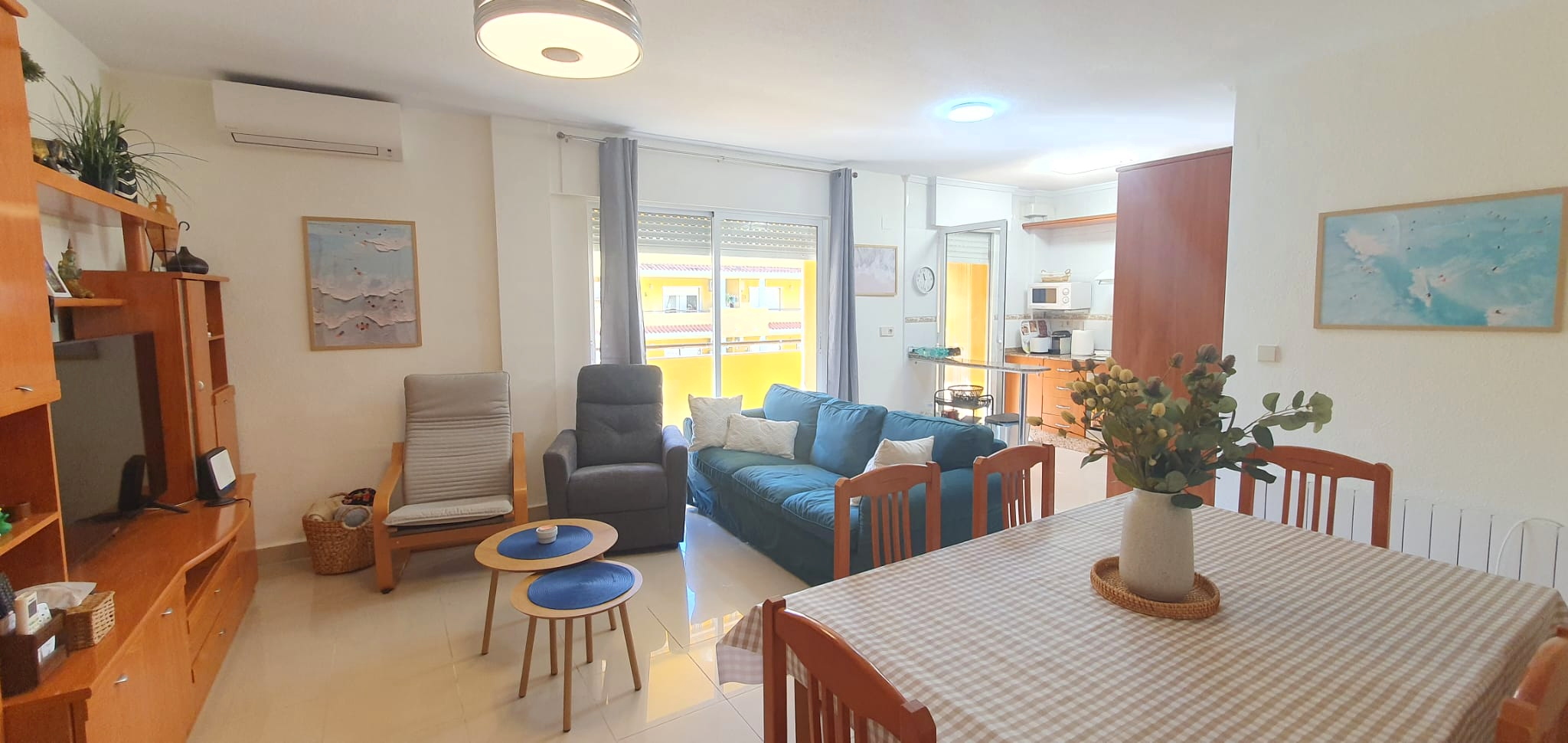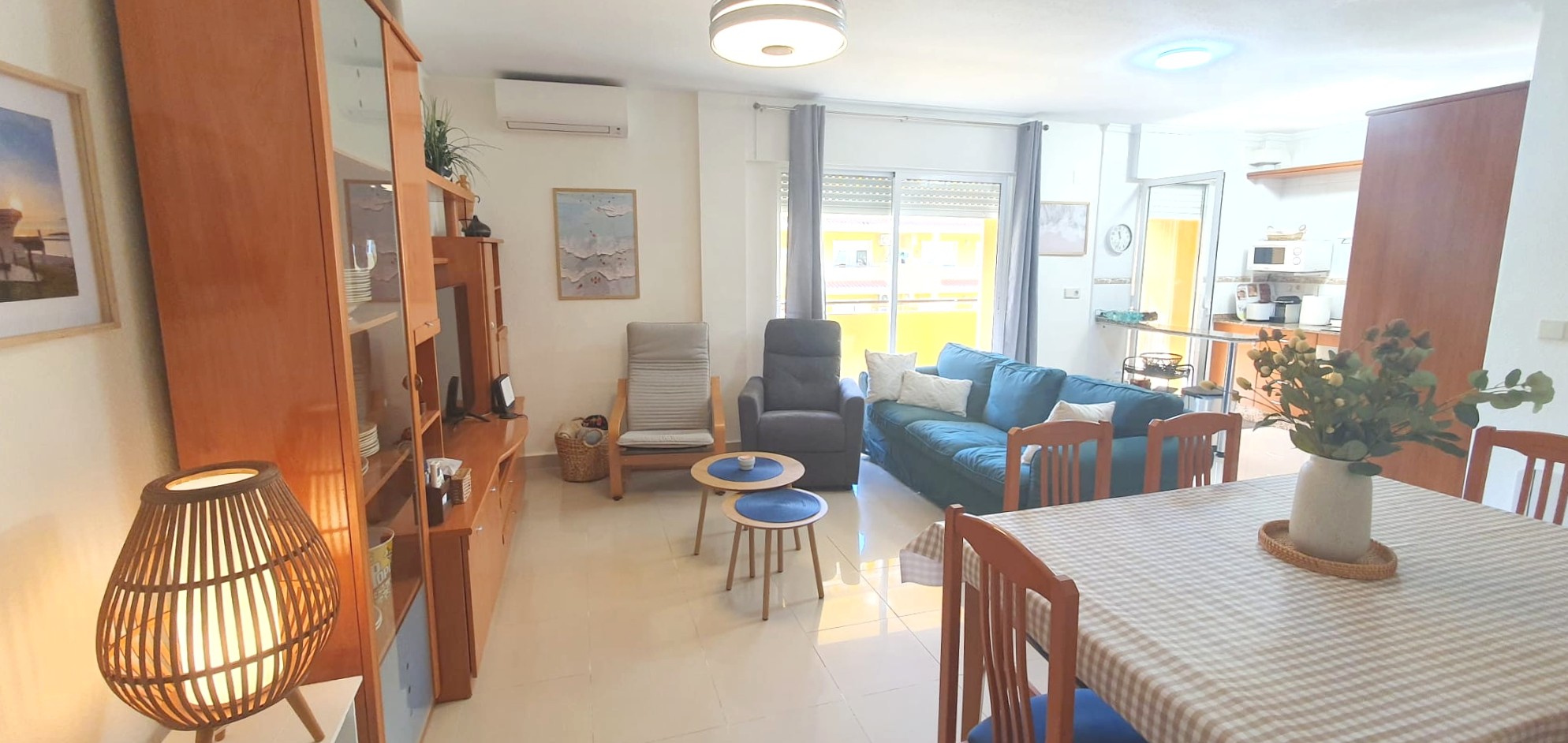 La cocina tipo americana está equipada con todo lo necesario: frigorífico, microondas, lavadora, vajilla, cubertería, utensilios de cocina. El salón-comedor, dotado de un split de aire acondicionado frío-calor, garantiza un ambiente agradable durante la estancia, desde aquí, accedes a una terraza con toldo, perfecta para relajarte al aire libre.