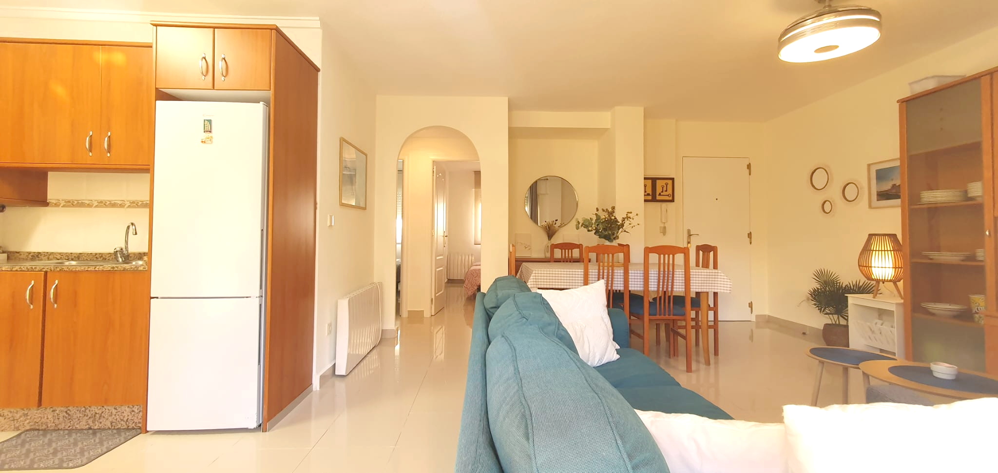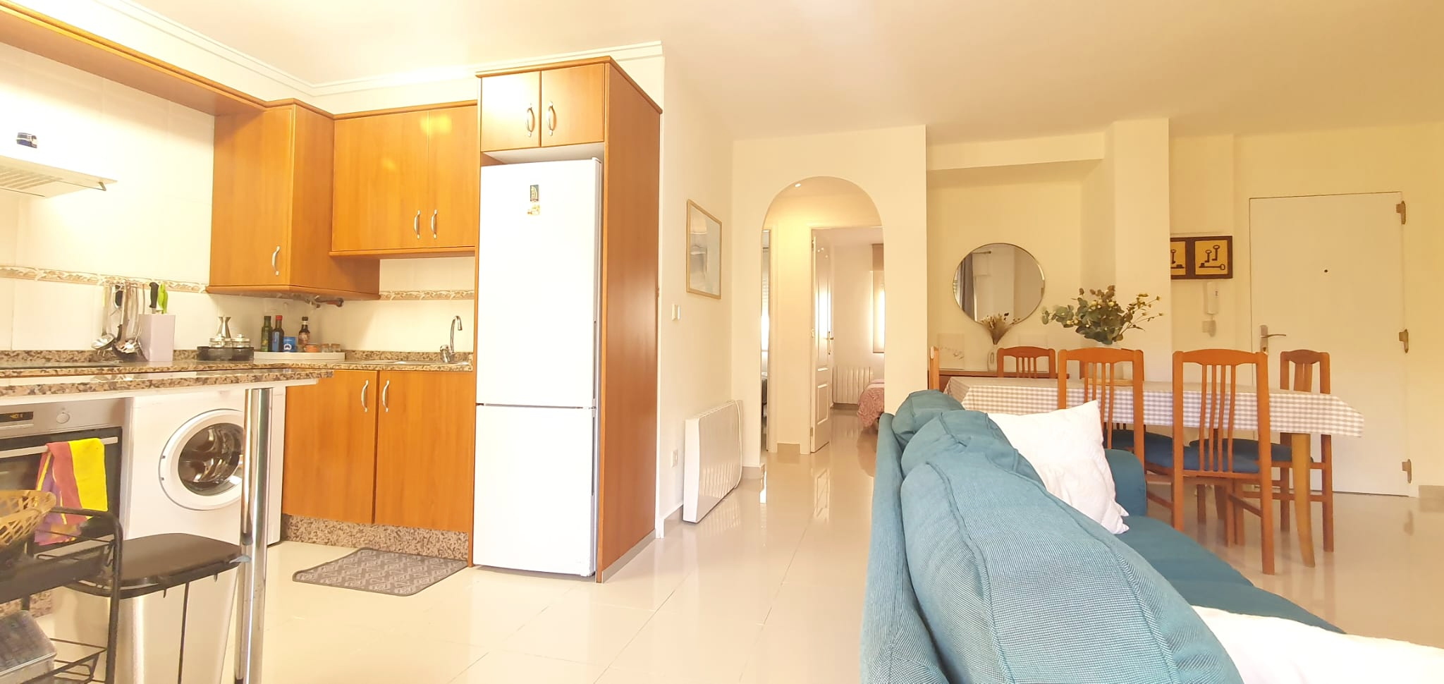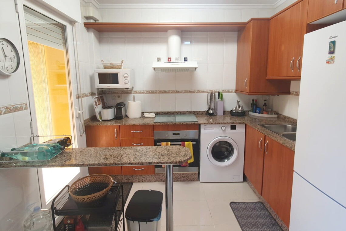 La cocina tipo americana está equipada con todo lo necesario: frigorífico, microondas, lavadora, vajilla, cubertería, utensilios de cocina. El salón-comedor, dotado de un split de aire acondicionado frío-calor, garantiza un ambiente agradable durante la estancia, desde aquí, accedes a una terraza con toldo, perfecta para relajarte al aire libre.